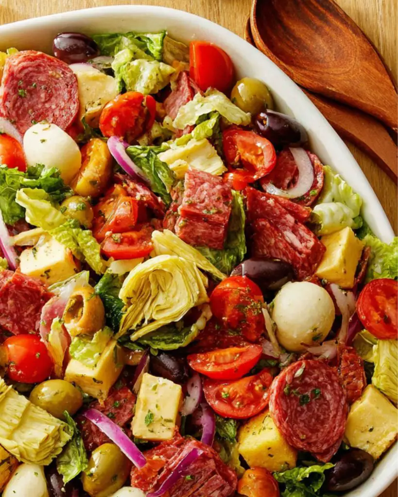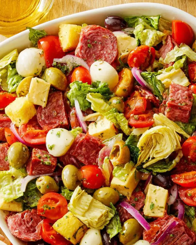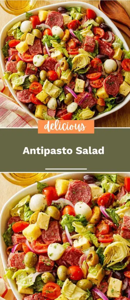 A colorful, flavor-packed salad, this Antipasto Salad combines crisp greens, savory cheeses, marinated vegetables, and Italian meats for a hearty and satisfying dish. Perfect as an appetizer, side, or light main course.