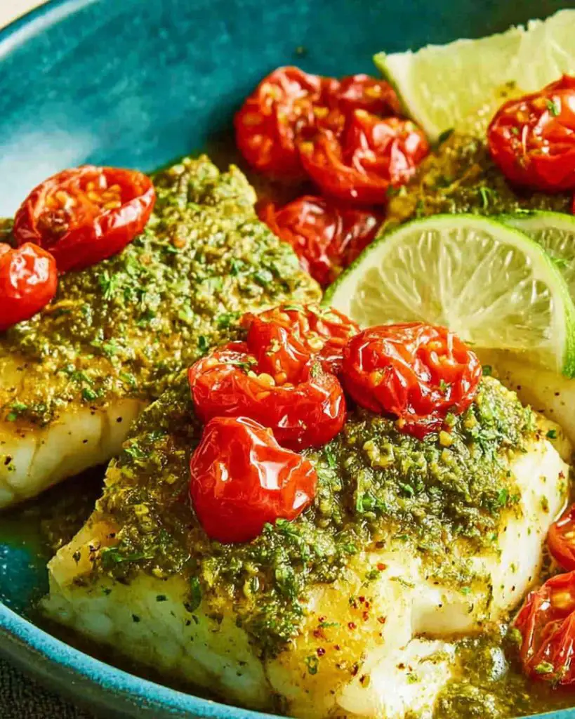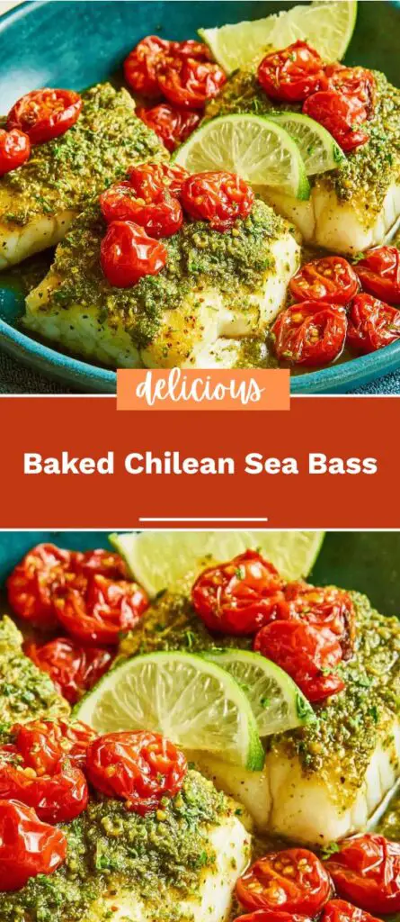 This baked Chilean sea bass recipe delivers flaky, tender fish with a flavorful topping of basil pesto and charred lemon. Seasoned with olive oil, red pepper flakes, and black pepper, the fish pairs perfectly with grape tomatoes for a light, healthy meal. Quick to prepare, this recipe is ideal for weeknight dinners or special occasions.