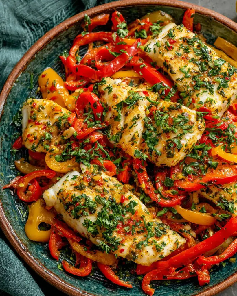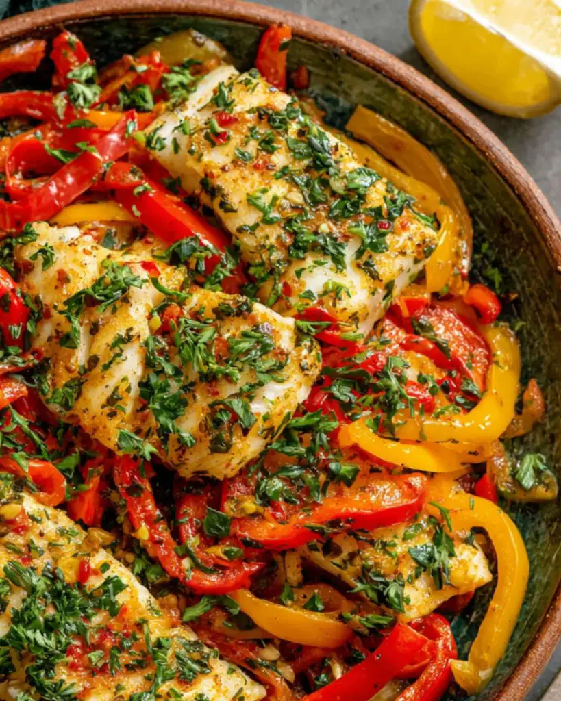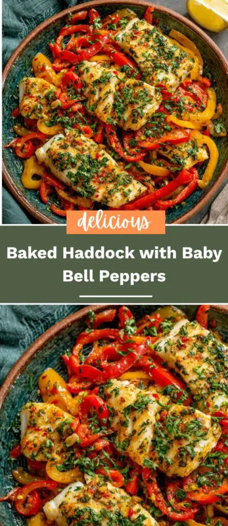Baked haddock fillets with sweet baby bell peppers, garlic, and lemon create a healthy, flavorful seafood dinner. Perfect for weeknight meals, Mediterranean-inspired dinners, or light, protein-rich dishes.