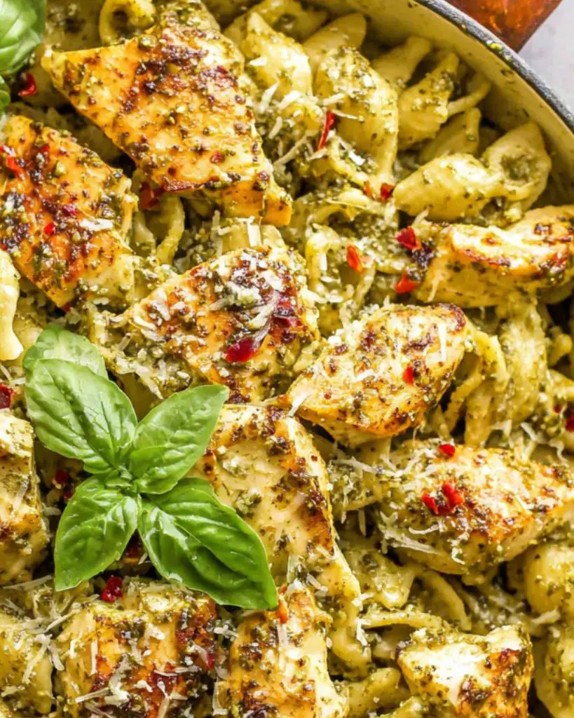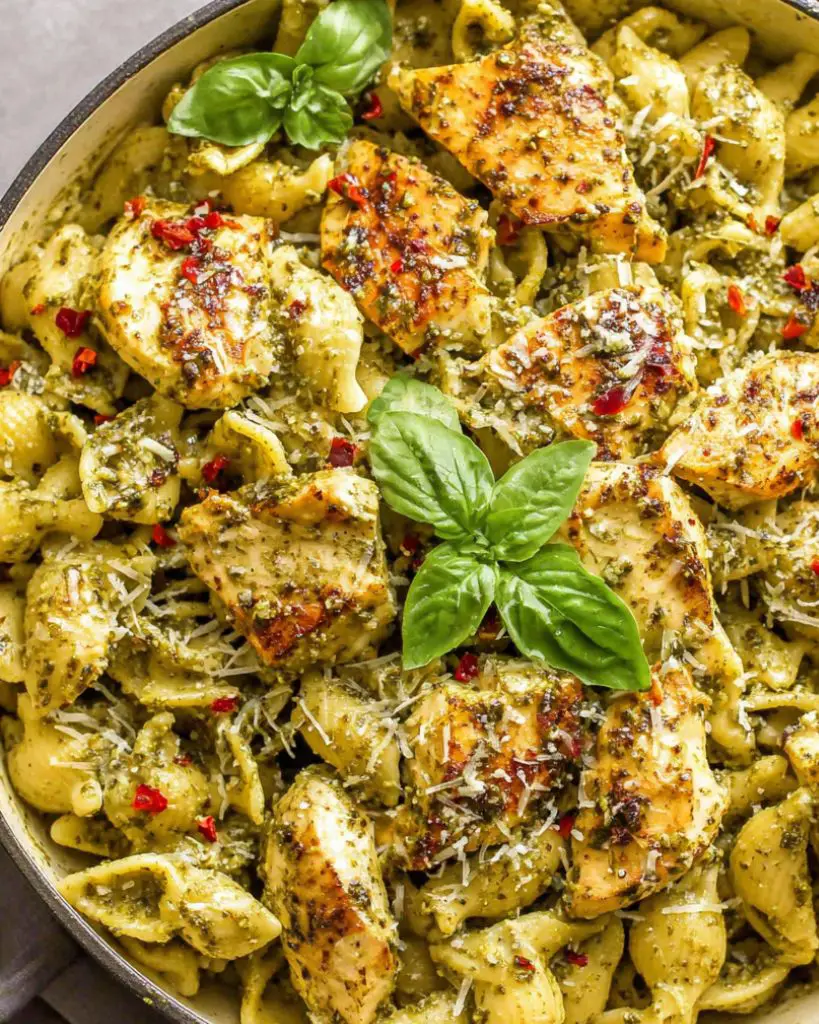 - Creamy, flavorful pasta with tender chicken and fresh basil pesto.