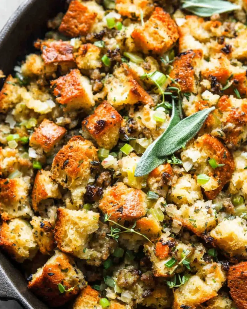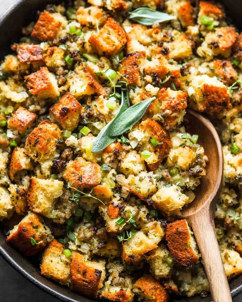 This homemade Thanksgiving Stuffing is soft, buttery, and full of comforting holiday flavor. With hearty bread cubes, savory sausage, fresh herbs, and vegetables, it’s the perfect side dish to complete your Thanksgiving table.
