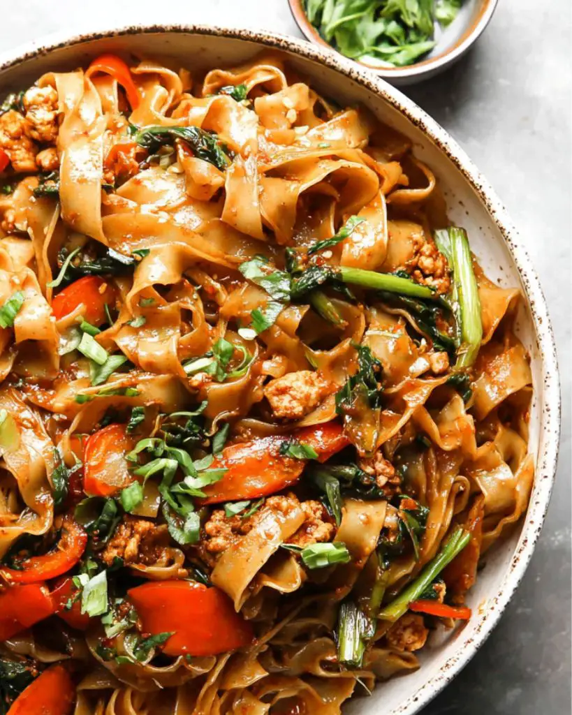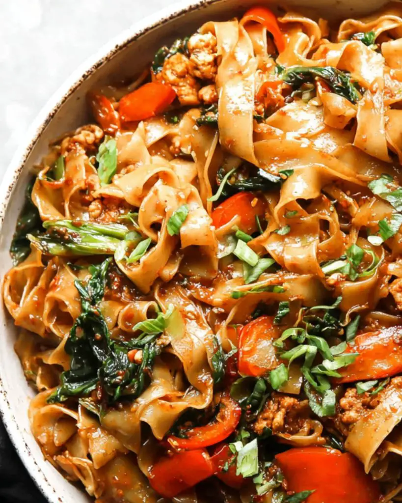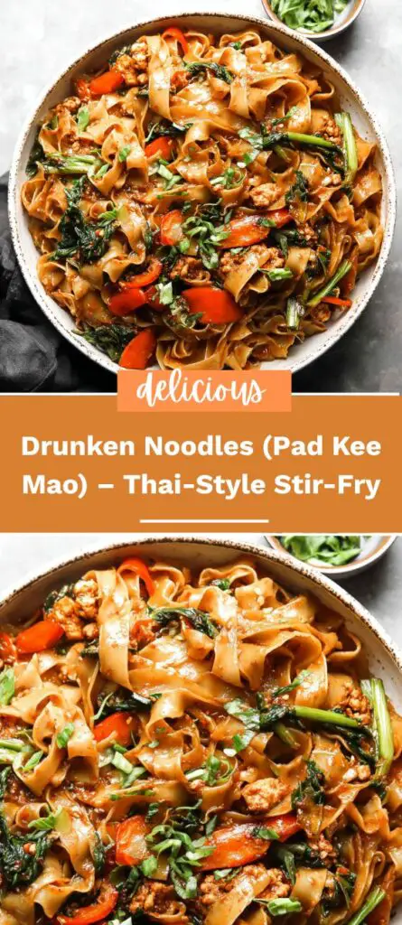 A vibrant and flavorful Thai stir-fry, these Drunken Noodles are packed with tender chicken (or shrimp/tofu), crisp vegetables, wide rice noodles, and a savory-spicy sauce. Quick to prepare and perfect for weeknight dinners, this recipe captures the authentic taste of Thai street food in your own kitchen.