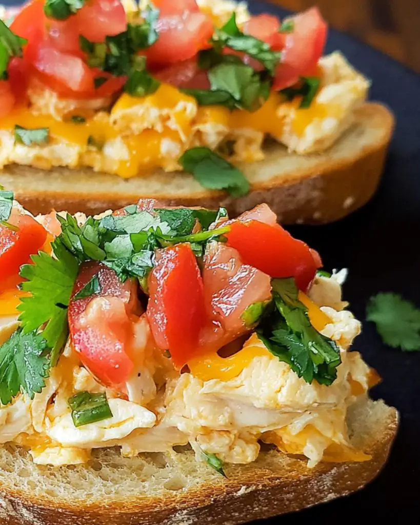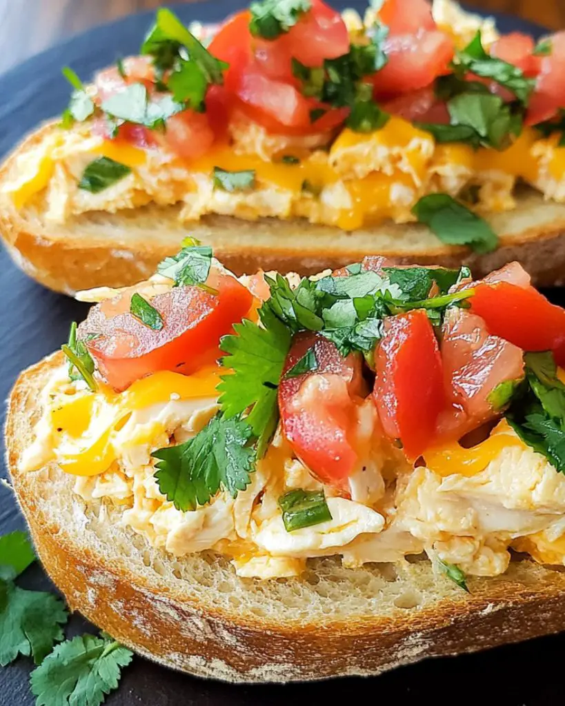 - Spread the chicken mixture generously over slices of your favorite bread. Arrange on a baking sheet.