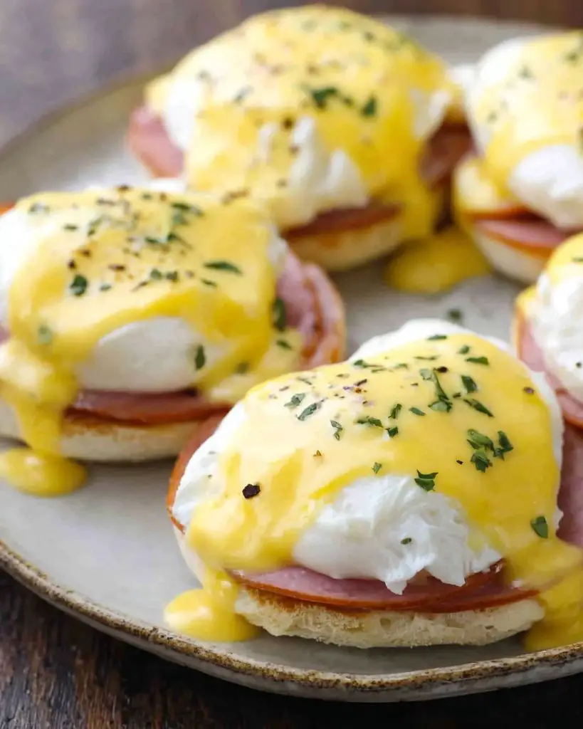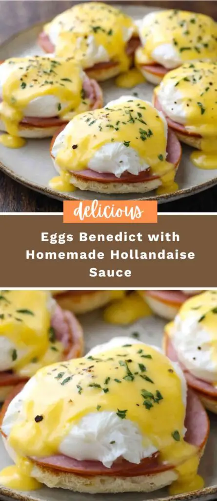 Eggs Benedict recipe with homemade Hollandaise sauce featuring perfectly poached eggs, crispy Canadian bacon, and toasted English muffins. Quick and classic brunch idea with creamy lemon Hollandaise sauce made from scratch. Perfect for weekend breakfasts or special brunch gatherings.