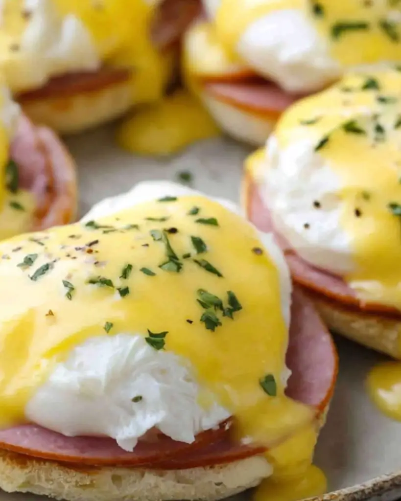 Serve Eggs Benedict immediately with a side of roasted potatoes, fresh fruit, or a light salad. Pair with mimosa, coffee, or fresh orange juice for a classic brunch. Garnish with chopped chives or paprika for added color and flavor.