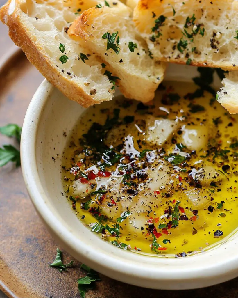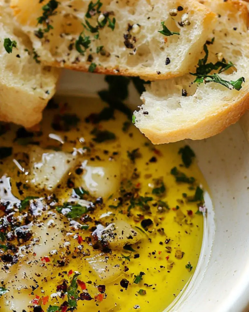 This Garlic Olive Oil Dip is a simple yet flavorful appetizer that’s perfect for any occasion. With a blend of aromatic garlic, zesty red pepper flakes, and earthy oregano, all infused into rich extra virgin olive oil, it delivers an irresistible combination of savory and spicy flavors. The freshly grated parmesan cheese adds a delightful creaminess, making each dip even more indulgent. It’s a quick and easy recipe that will elevate any meal, from casual dinners to festive gatherings.