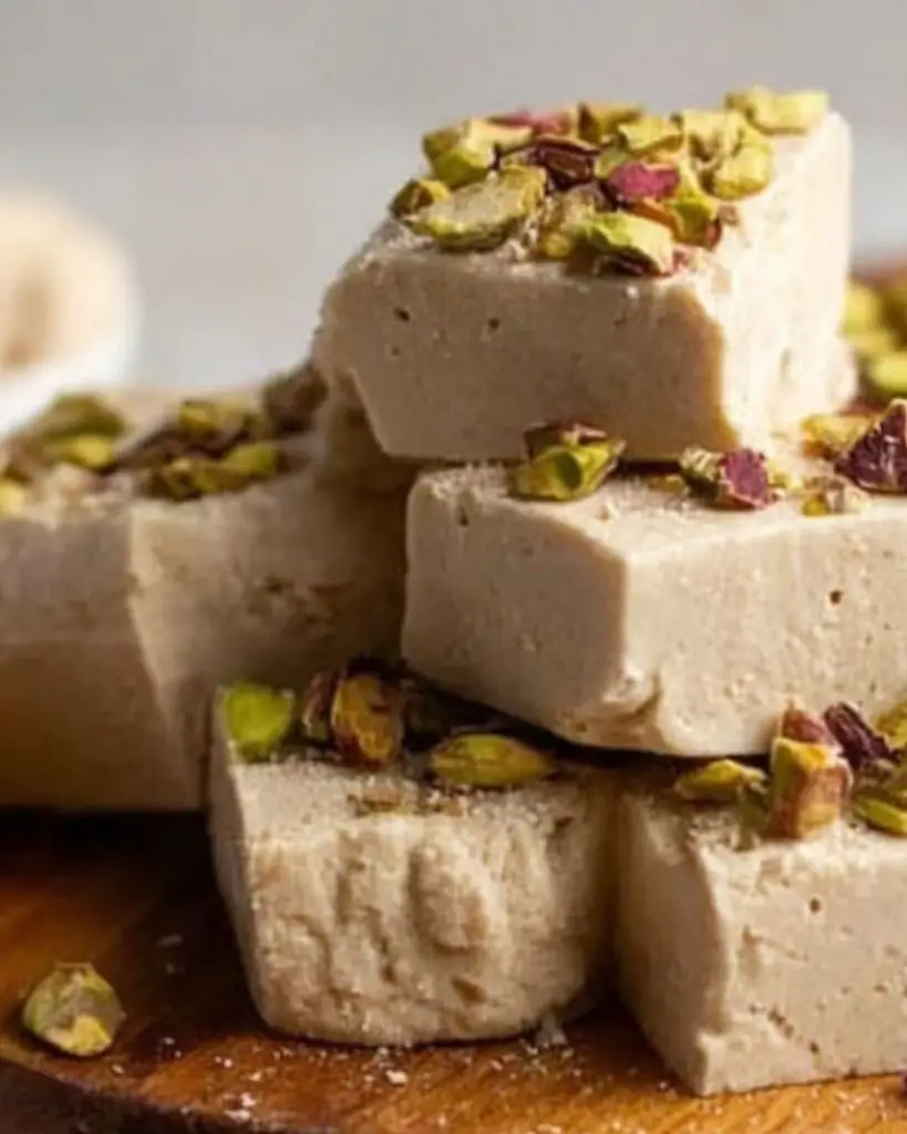 This homemade halva features smooth tahini mixed with sweet sugar syrup and flavored with vanilla and salt. Topped with roasted pistachios, it’s a traditional Middle Eastern dessert that’s easy to make and perfect for snacks, gifting, or serving alongside coffee and tea.