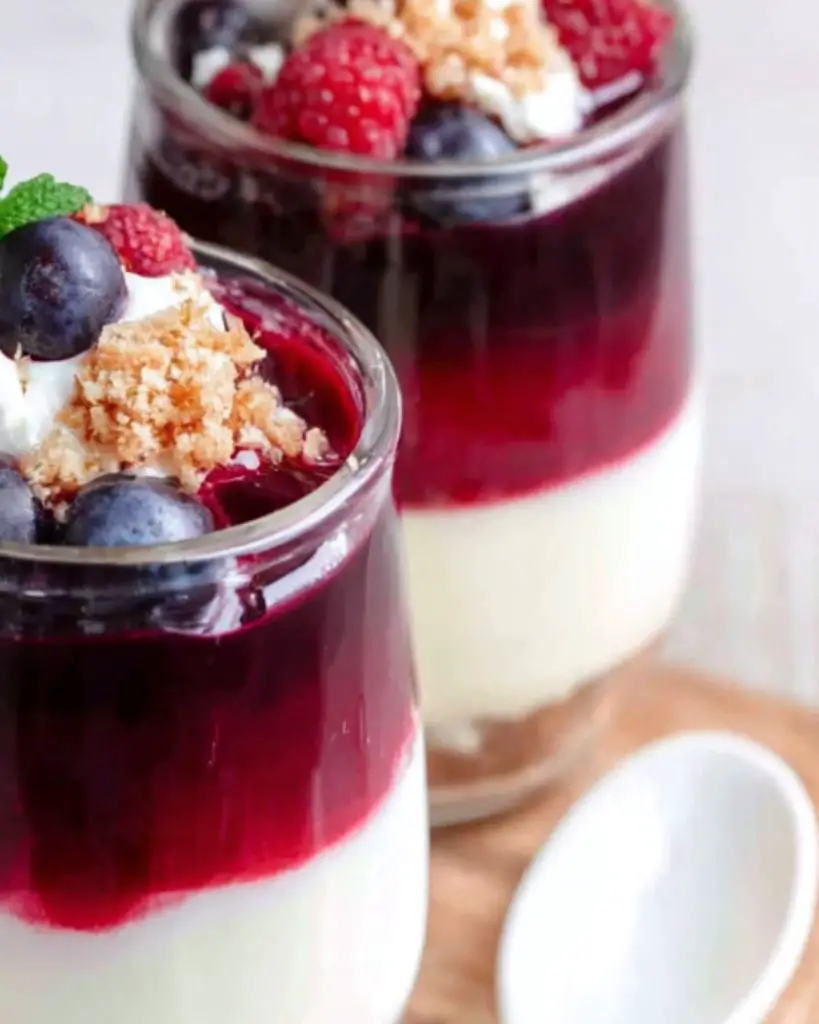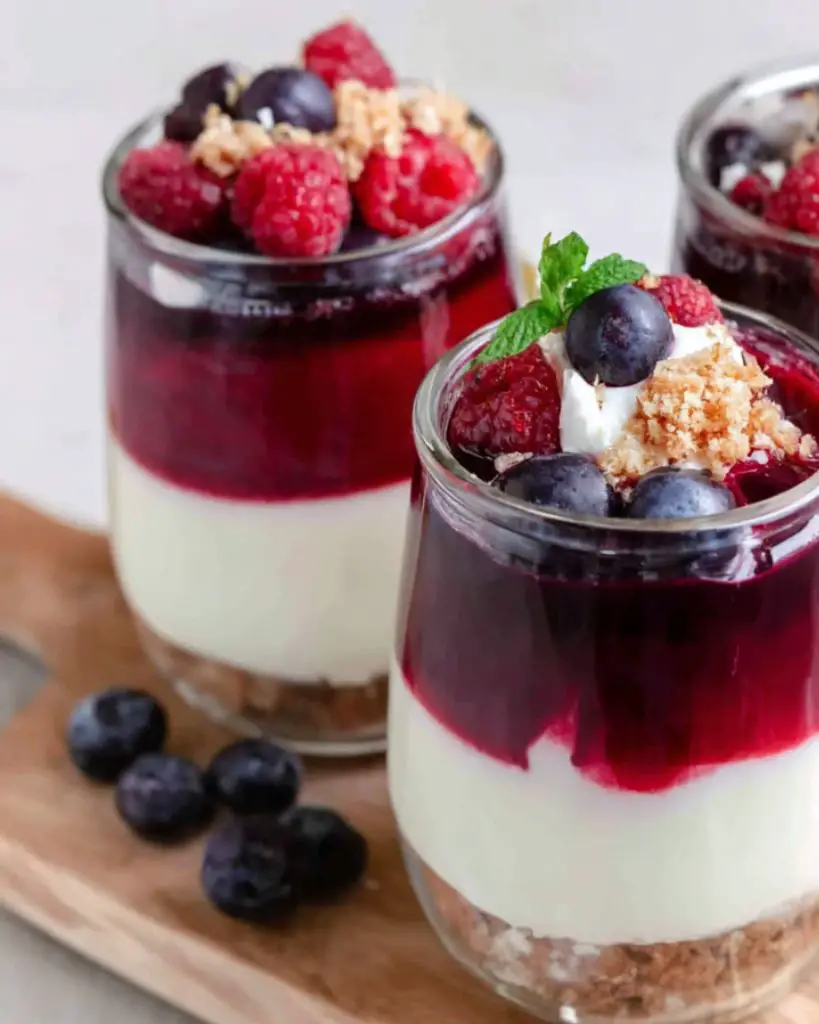 These lemon cheesecake yogurt parfaits are creamy, tangy, and naturally sweet. They combine bright lemon flavor with rich cottage cheese and Greek yogurt, layered with fresh berry compote and crunchy toasted almonds for a balanced texture.