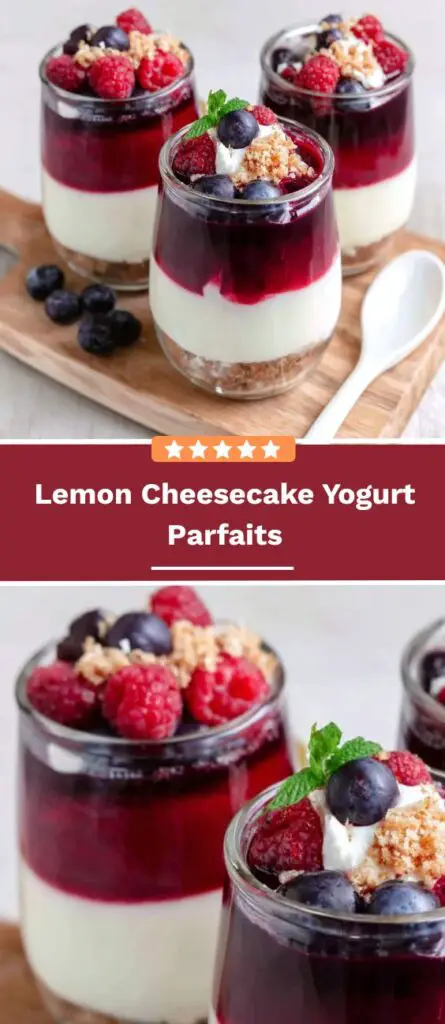 Creamy lemon cheesecake yogurt parfaits layered with fresh berry compote and toasted almonds. This easy, healthy dessert or breakfast is refreshing, naturally sweet, and ready in minutes.