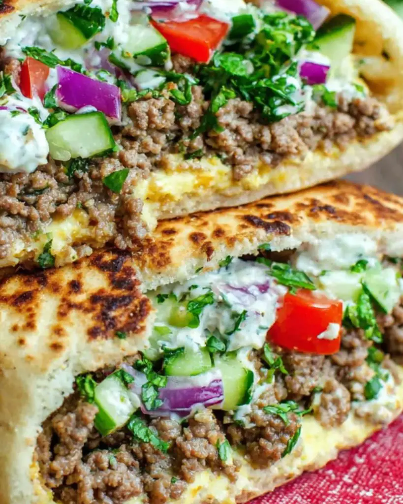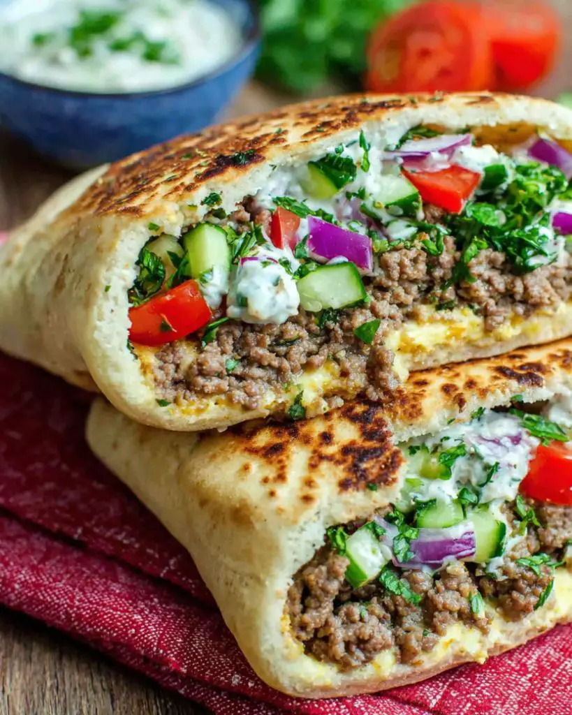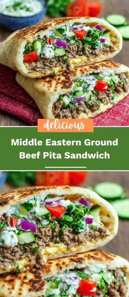 Middle Eastern ground beef pita sandwiches feature spiced, juicy beef with aromatic allspice, cardamom, and paprika, tucked into soft pita pockets. Topped with fresh tomatoes, cucumbers, onions, and a drizzle of tahini sauce, these sandwiches make a quick and flavorful lunch, dinner, or party snack. Perfect for Mediterranean-inspired meals or easy weeknight dinners.