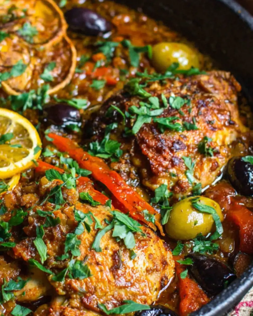 This Moroccan chicken recipe features tender bone-in chicken cooked with Ras El Hanout, cinnamon, paprika, garlic, olives, and dried fruits. Aromatic and flavorful, it’s perfect for family dinners or special occasions, served over couscous or rice for a traditional Moroccan meal.