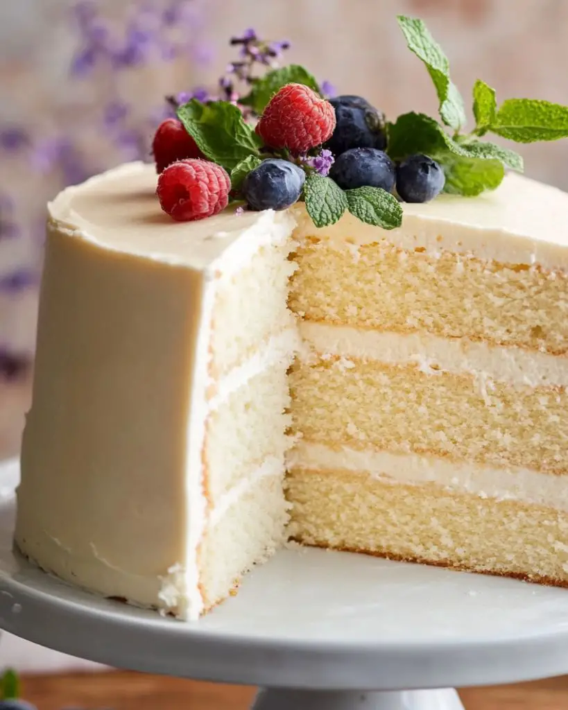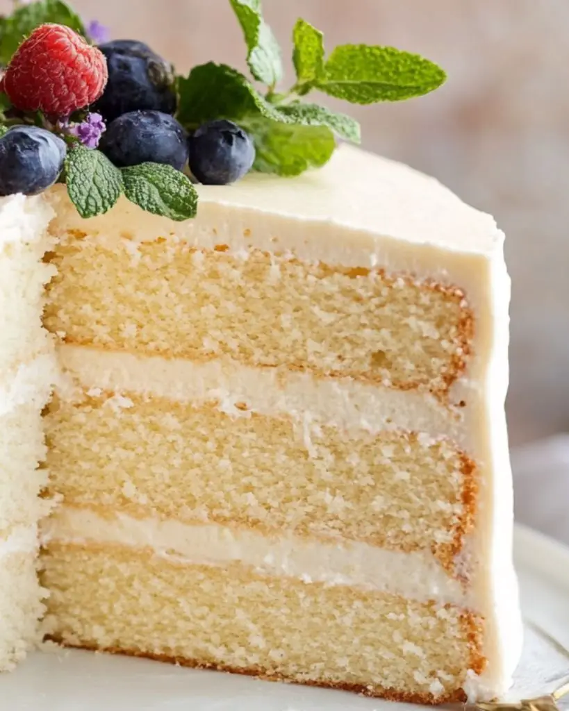 This moist vanilla cake is made with simple ingredients like unsalted butter, granulated sugar, and cake flour, creating a light and airy crumb. Topped with a creamy buttercream frosting, it’s the perfect dessert for those who love the classic flavors of vanilla and almond.