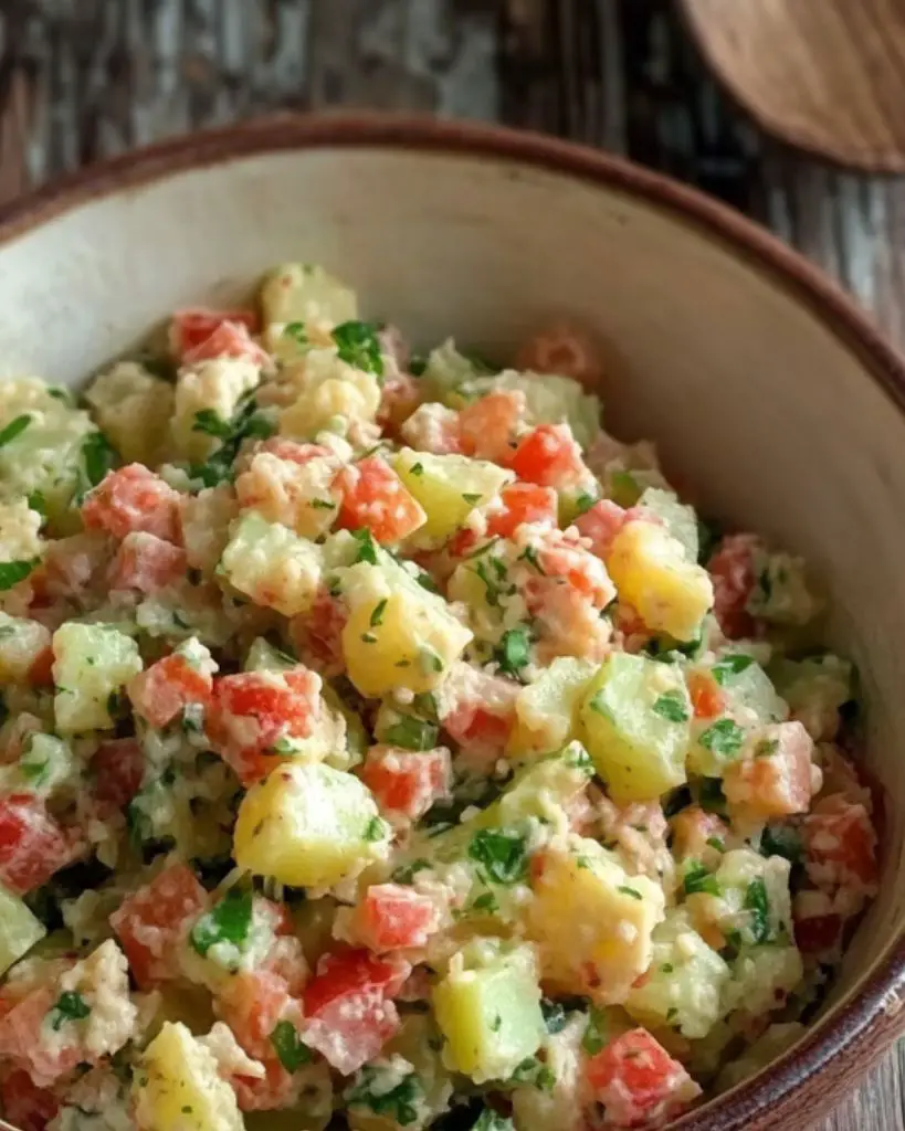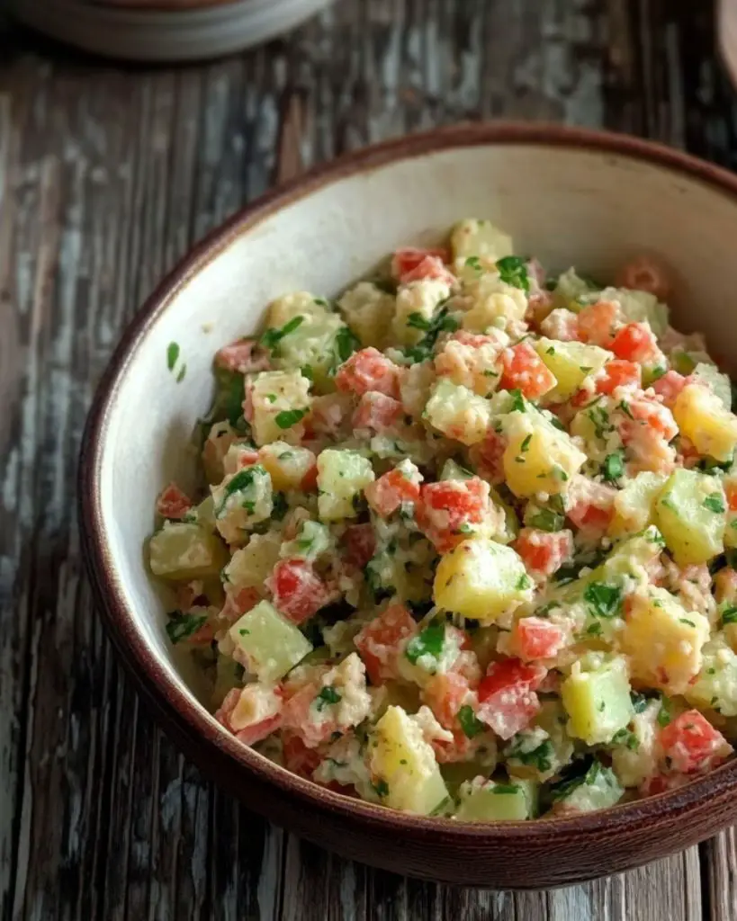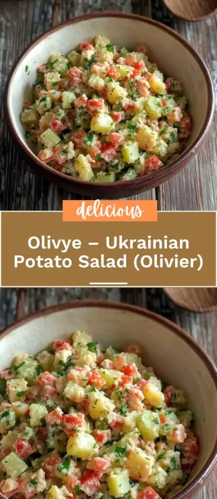 This traditional Ukrainian Olivye salad features diced ham, boiled potatoes, carrots, eggs, and pickles mixed with creamy mayonnaise and fresh herbs. Perfect for holidays, family dinners, and potlucks, this classic potato salad recipe offers a rich blend of flavors and textures. Easy to prepare and customizable, it makes a great side dish or light meal option for any occasion.