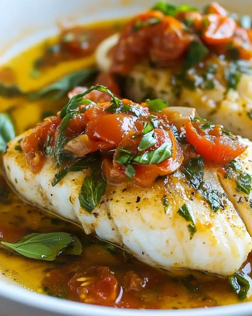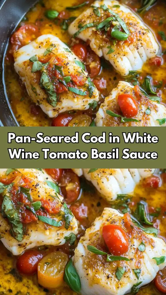 Looking for a healthy and flavorful seafood dish? This Pan-Seared Cod in White Wine Tomato Basil Sauce is a delicious, easy-to-make recipe perfect for dinner. Cod fillets are perfectly seared in a hot skillet, creating a crispy golden crust, then topped with a vibrant sauce made from cherry tomatoes, white wine, and fresh basil. With a hint of lemon juice and crushed red pepper flakes, this dish offers a perfect balance of savory and tangy flavors.