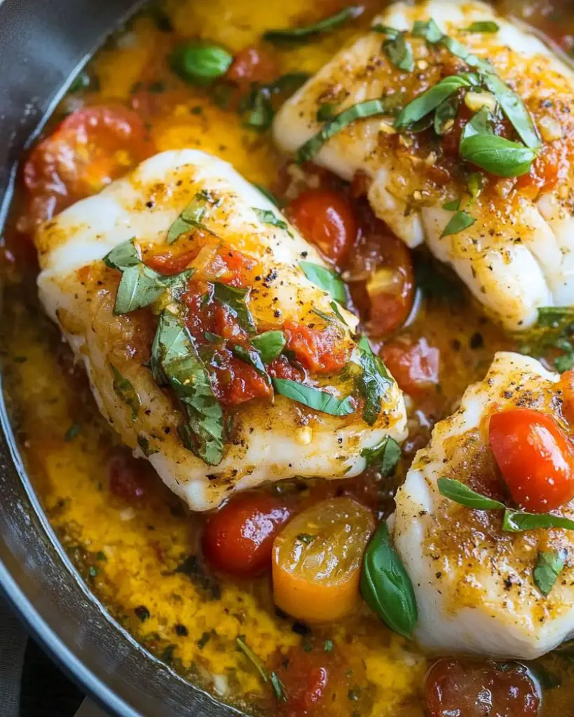 Pan-Seared Cod in White Wine Tomato Basil Sauce