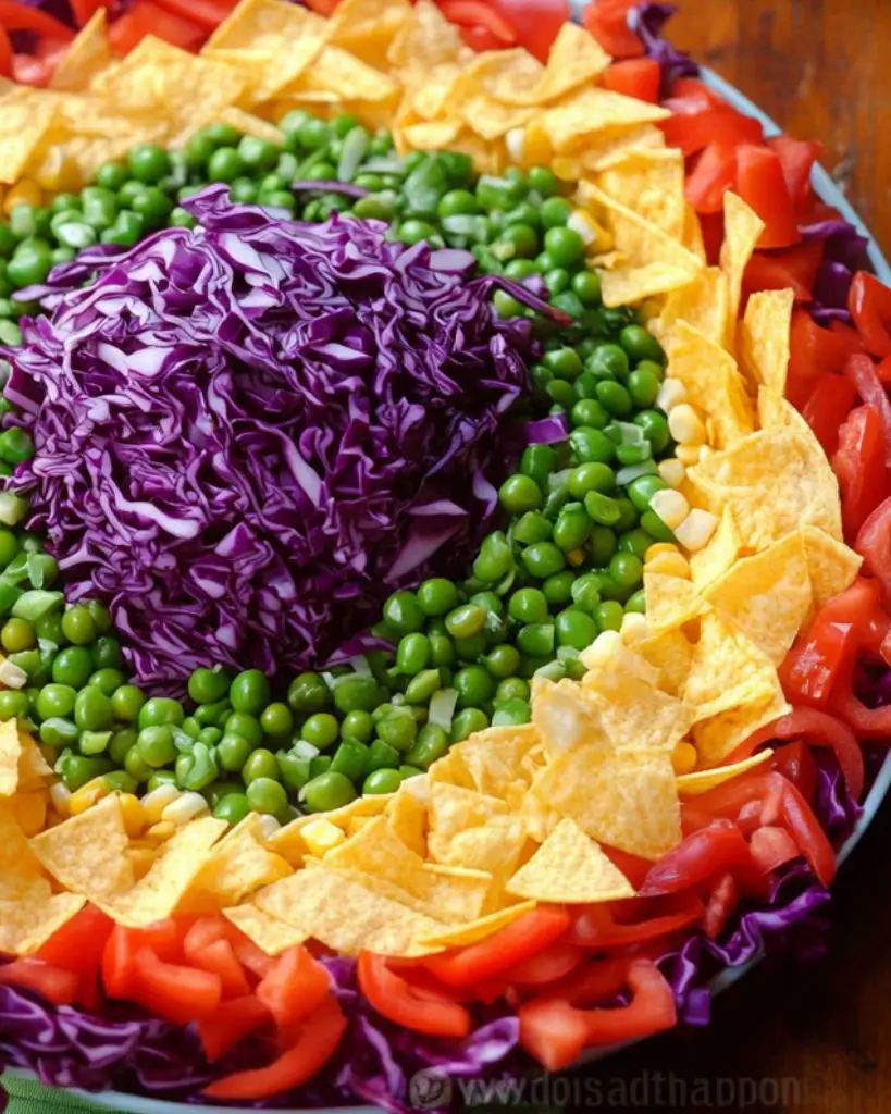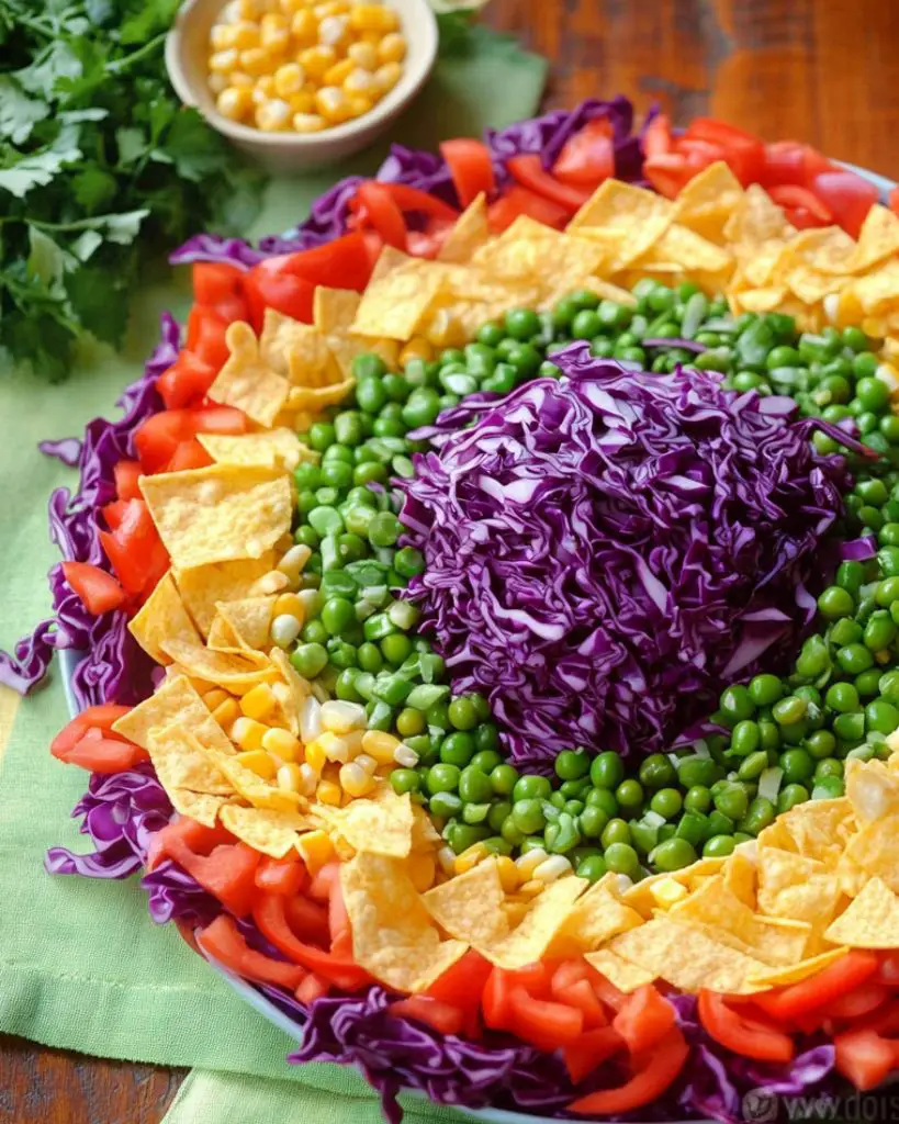 - Layer the ingredients around the cup, starting with the peas to form the inner circle. Build outward with the red cabbage, grated beet, bell pepper slices, corn, green onion, and chow mein noodles.