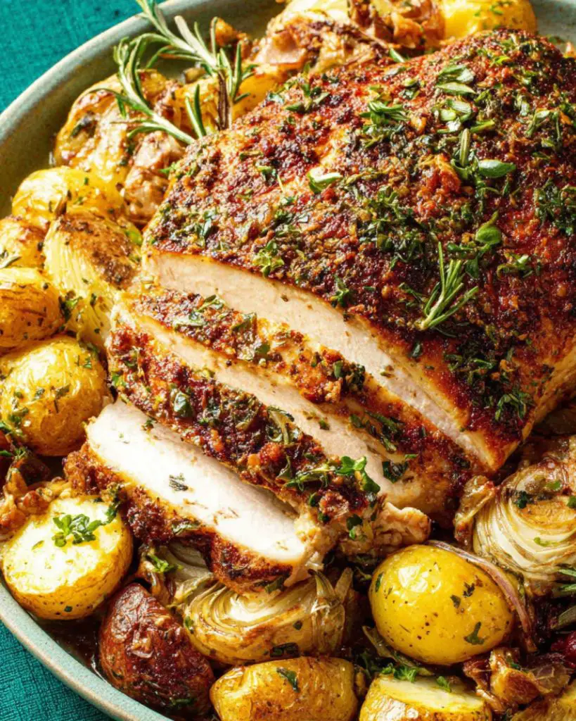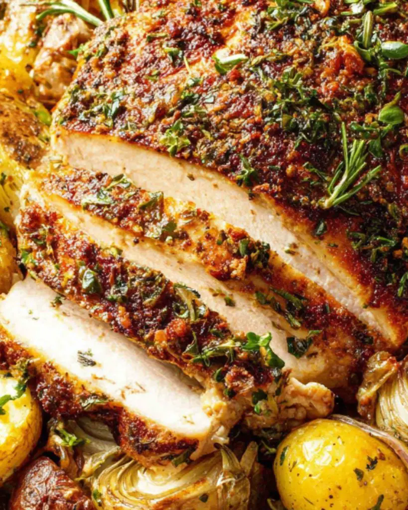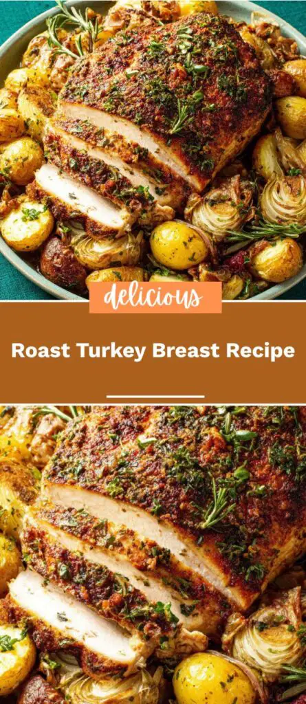 This roast turkey breast is tender and juicy, seasoned with garlic, herbs, and spices, and paired with roasted grapes and vegetables. Perfect for holiday dinners, family meals, or special occasions.