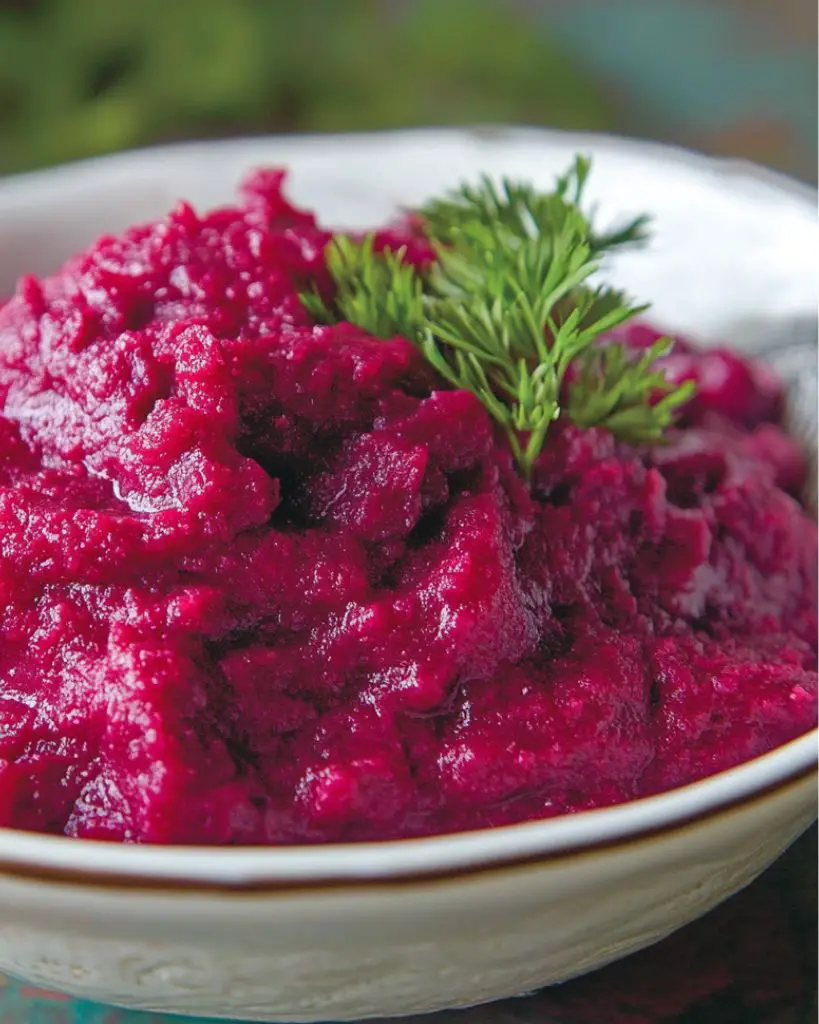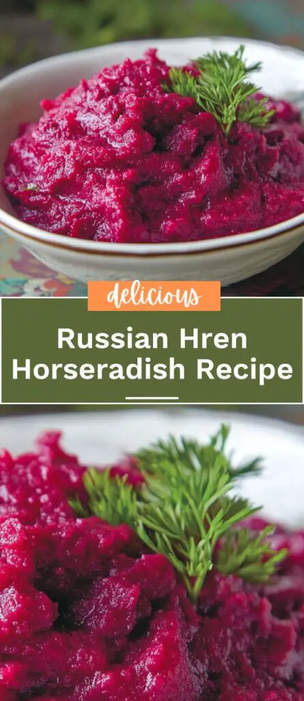 Russian Hren Horseradish is a tangy and spicy condiment made from freshly cooked beets and extra hot horseradish. This simple recipe combines earthy beets with a kick of heat from horseradish, perfect for adding flavor to meats, sandwiches, or salads. Quick and easy to prepare, this traditional horseradish blend is a great addition to any meal, offering a bold, savory taste that pairs well with roasted meats and hearty dishes.