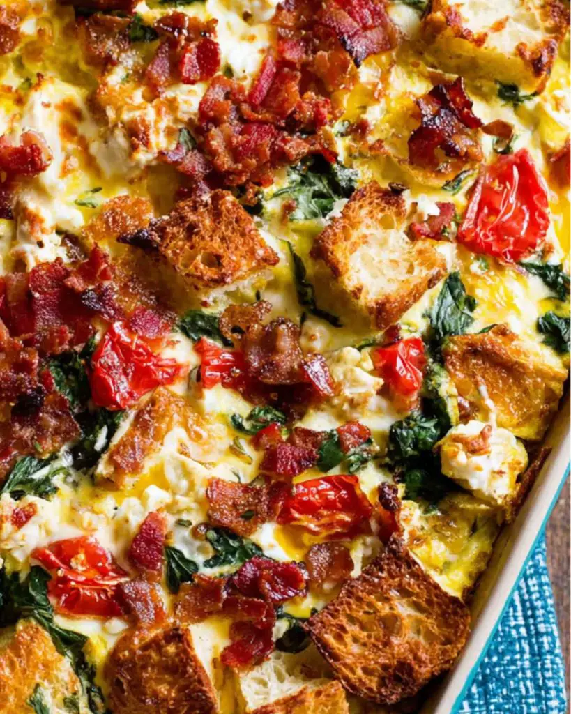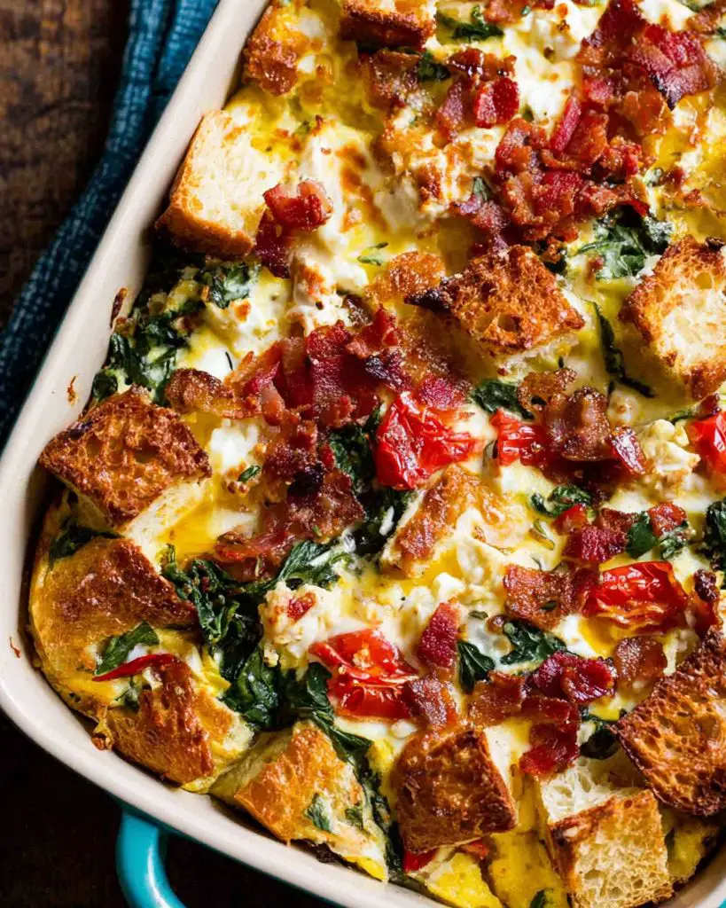 This baked egg strata combines crusty bread, spinach, roasted red peppers, prosciutto, and a mix of chevre and Parmesan cheeses for a hearty breakfast or brunch casserole. Packed with vegetables, protein, and rich flavors, it’s perfect for feeding a crowd or prepping ahead for busy mornings.